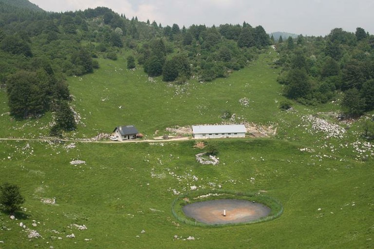 La malga è situata all’interno di una dolina, depressione carsica chiamata “fossa” nella parlata locale.