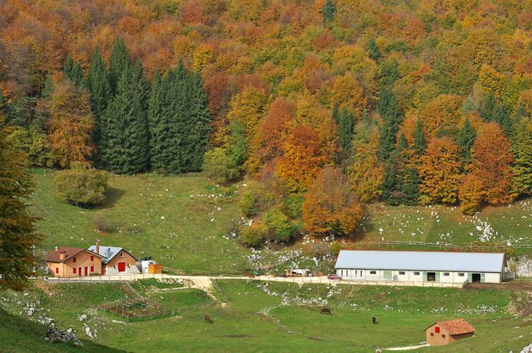 Gli edifici della malga sono contornati dalla faggeta che a fine monticazione assume una ricca varietà di colori.
